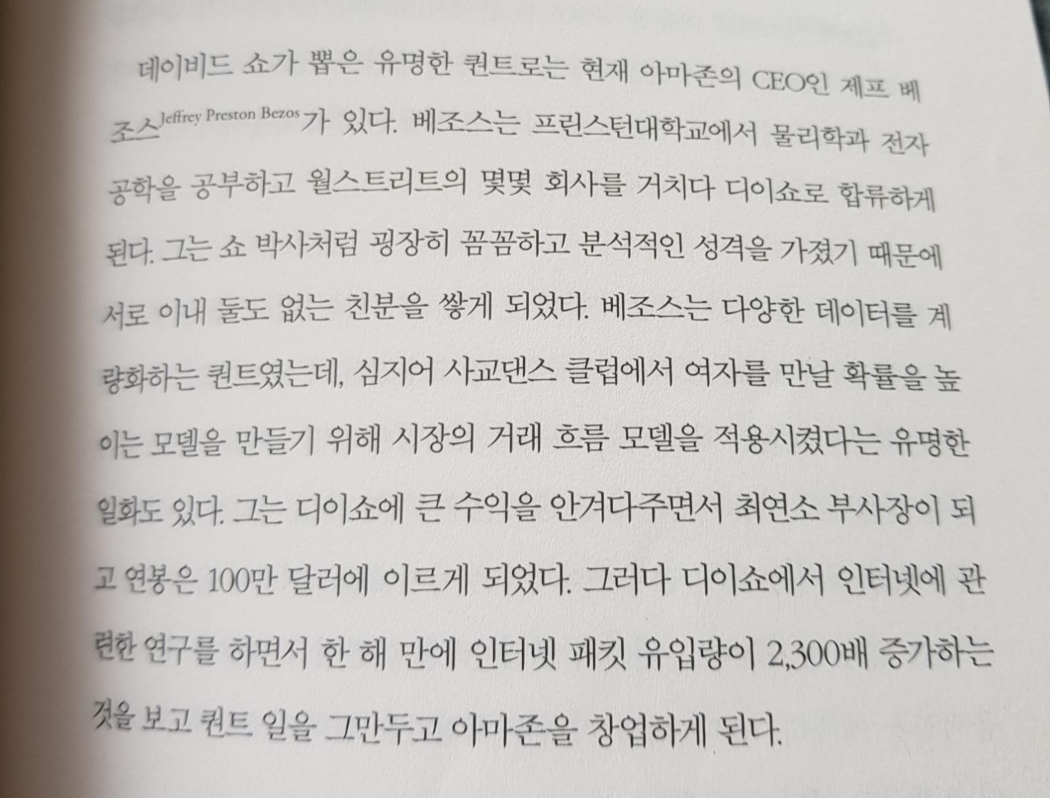 인공지능, 소프트웨어, 투자, 퀀트에 관심있는 사람이라면 강력 추천!! 퀀트에 대해서 간단한 설명과 함께 퀀트의 간략한 역사로 시작해서 저자의 퀀트 생활 경험담이 훅 들어온다. 어렵지 않을 뿐만 아니라 개인의 경험담을 바탕으로 소설처럼 재미있게 이야기를 풀어가고 있어서 읽는 내내 흥미로운 생각이 많이 떠올랐다.