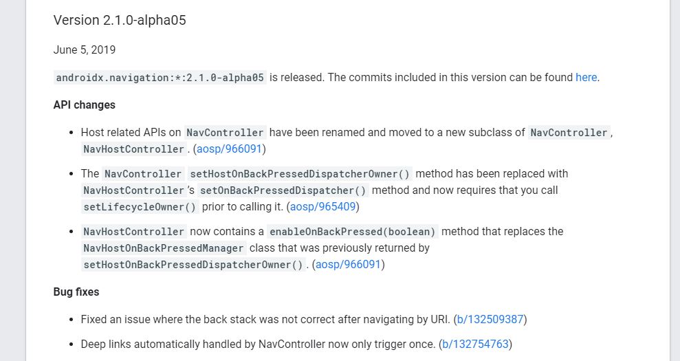 Jetpack의 장점은 빠른 수정이 가능하고, 필요에 따라서 취사 선택이 가능하다. 플랫폼 API 라이브러리는 구현된 모든 모듈이 기본 탑재되고, 하위 호환성도 보장해야 하기 때문에 개발 후 배포까지 시간이 오래걸린다. 작은 문제를 수정 한다고 해서 모든 단말에 수정 버전을 설치 한다는 것은 사실상 불가능하기 때문에, 오류가 있어도 수정이 어렵고, 개선해도 적용되는데 시간이 오래걸린다. 반면 Jetpack은 개발자가 패키지를 직접 설치하는 방식이기에 수정이 잦고 빠르다. API도 하위 호환성을 보장할 필요가 없기 때문에 막 바뀐다. 출시 노트를 보면 API가 자주 변경되는 것을 확인 할 수 있다.