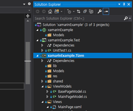 기본 Project는 내가 잘 쓰는 구조다. Shared project에 플랫폼 독립적인 코드를 작성하고, .Test 프로젝트에는 Shared project에 대한 unit test를 구성한다. 플랫폼 독립적인 내용이기 때문에 TFM을 .netcoreapp으로 해서 VS에서 쉽고 빠르게 테스트가 가능하다. 물론 이런 구조가 익숙치도 않고 이상하다고 생각할 지도 모르겠지만, 지금까지는 꽤 괜찮은거 같다. 테스트하기도 편하고, SoC도 분명하다. .Tizen 프로젝트의 코드를 테스트 할 수 없는 것이