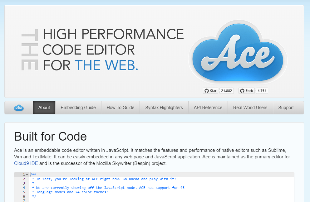 Ace is an embeddable code editor written in JavaScript. It matches the features and performance of native editors such as Sublime, Vim and TextMate.