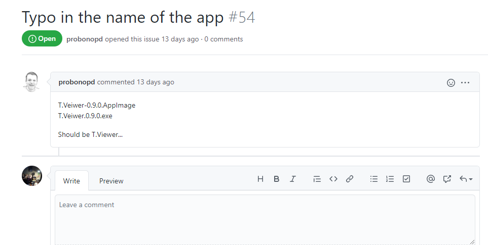 벌써 프로젝트에 기여한 분이 2분이나 계신다. 한분은 파트 동료라서 생략해도 될만한데, 다른 한분은 완전 모르는 사람이다. 게다가 독일 사람...게다가 1.0.0 공개하기도 전에! 내가 issue를 놓치고 있었네.ㅠ 아직까지 T.Veiwer라고 표시되고 있다. Typo...ㅠ 열 댓 명의 알파테스터는 모두 한국인이었기에 잡을 수 없던 문제인가ㅋㅋㅋㅋㅋㅋㅋ