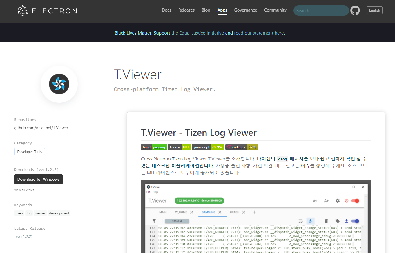 Cross Platform Tizen Log Viewer를 소개합니다. T.Viewer는 윈도우즈와 리눅스 데스크탑 PC에서도 타이젠 단말의 로그를 쉽게 볼 수 있는 프로그램입니다. Javascript, css, html의 웹 기술을 사용해서 윈도우즈, 리눅스 그리고 MAC에서 구동되는 앱을 만들 수 있는 electron 프레임웍을 이용해서 개발되었으며, GUI framework으로 vuetify를 사용하였습니다. MIT 라이센스로 공개된 오픈소스 프로젝트로써 T.Viewer Github repository에서 누구나 다운받아서 사용할 수 있습니다.