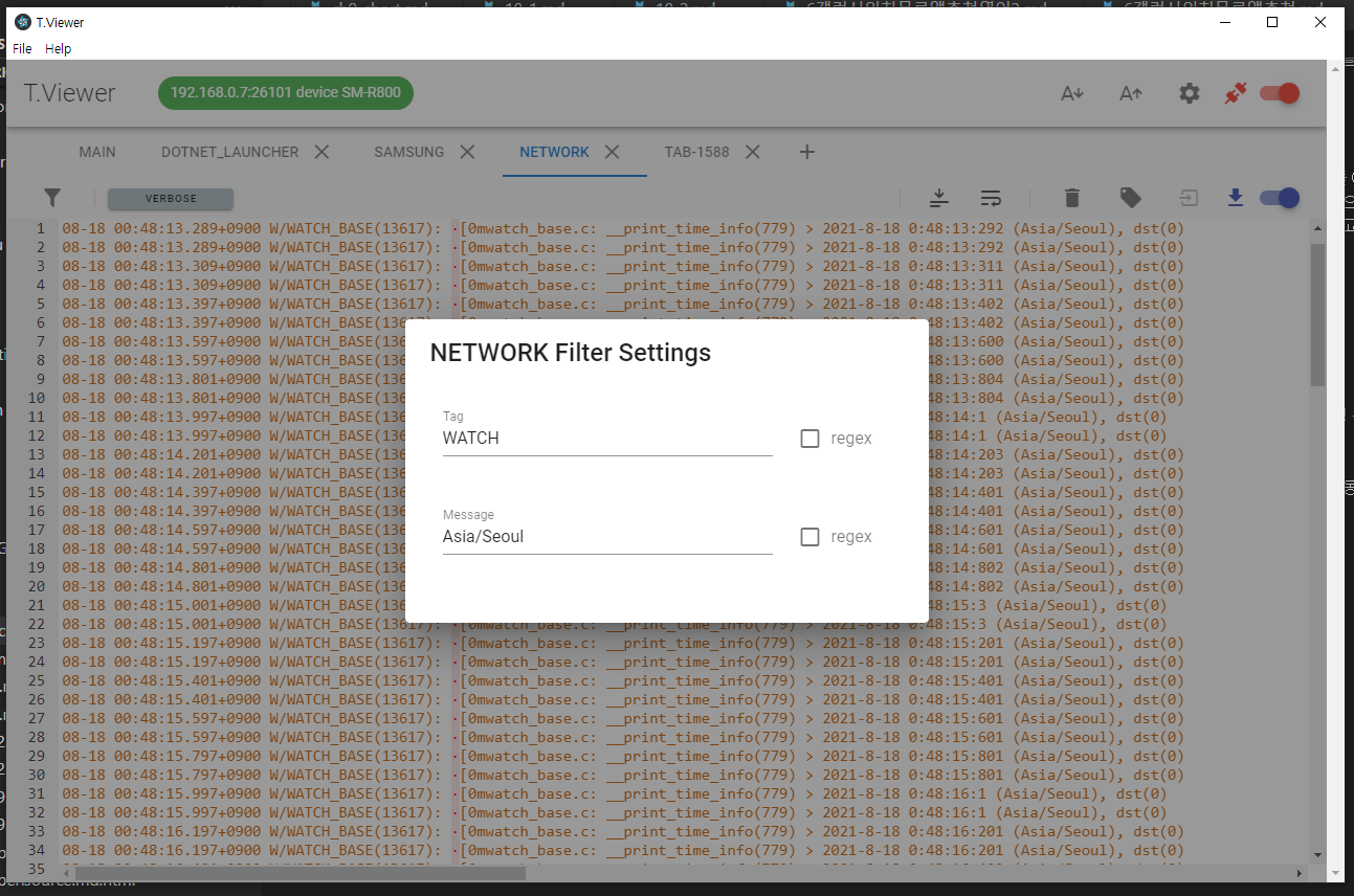 관심있는 로그를 골라서 보기 위해서 로그 레벨, 태그, 메세지의 필터를 적용할 수 있습니다. 태그와 메세지의 경우 정규식을 사용한 필터를 사용할 수도 있습니다. 로그 레벨에 따라 로그 메세지의 색상이 다르게 적용되어서 쉽게 구분됩니다.