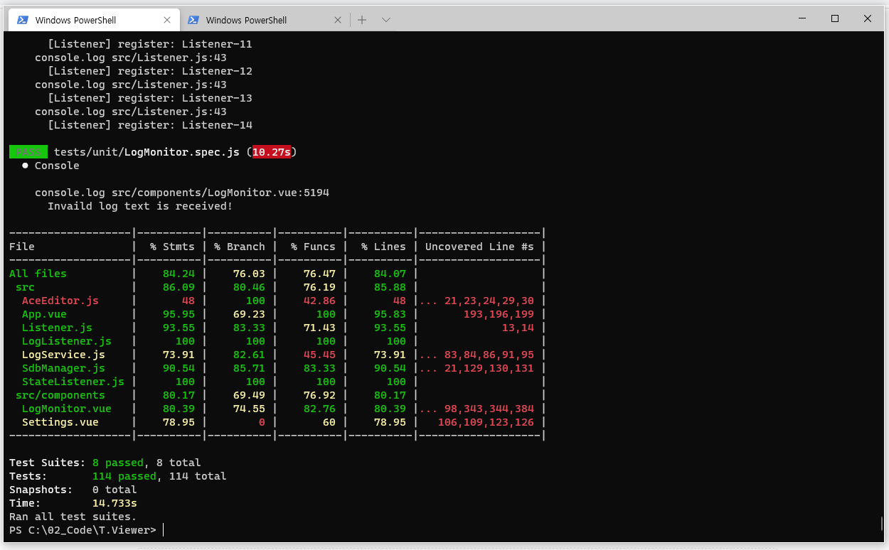 T.Viewer는 TDD를 사용해서 개발되었습니다. 코드 커버리지가 무려 87%입니다! 잘 갖춰진 테스트를 믿고 T.Viewer 개발에 뛰어 들어보세요. 컨트리븃은 언제나 환영입니다.