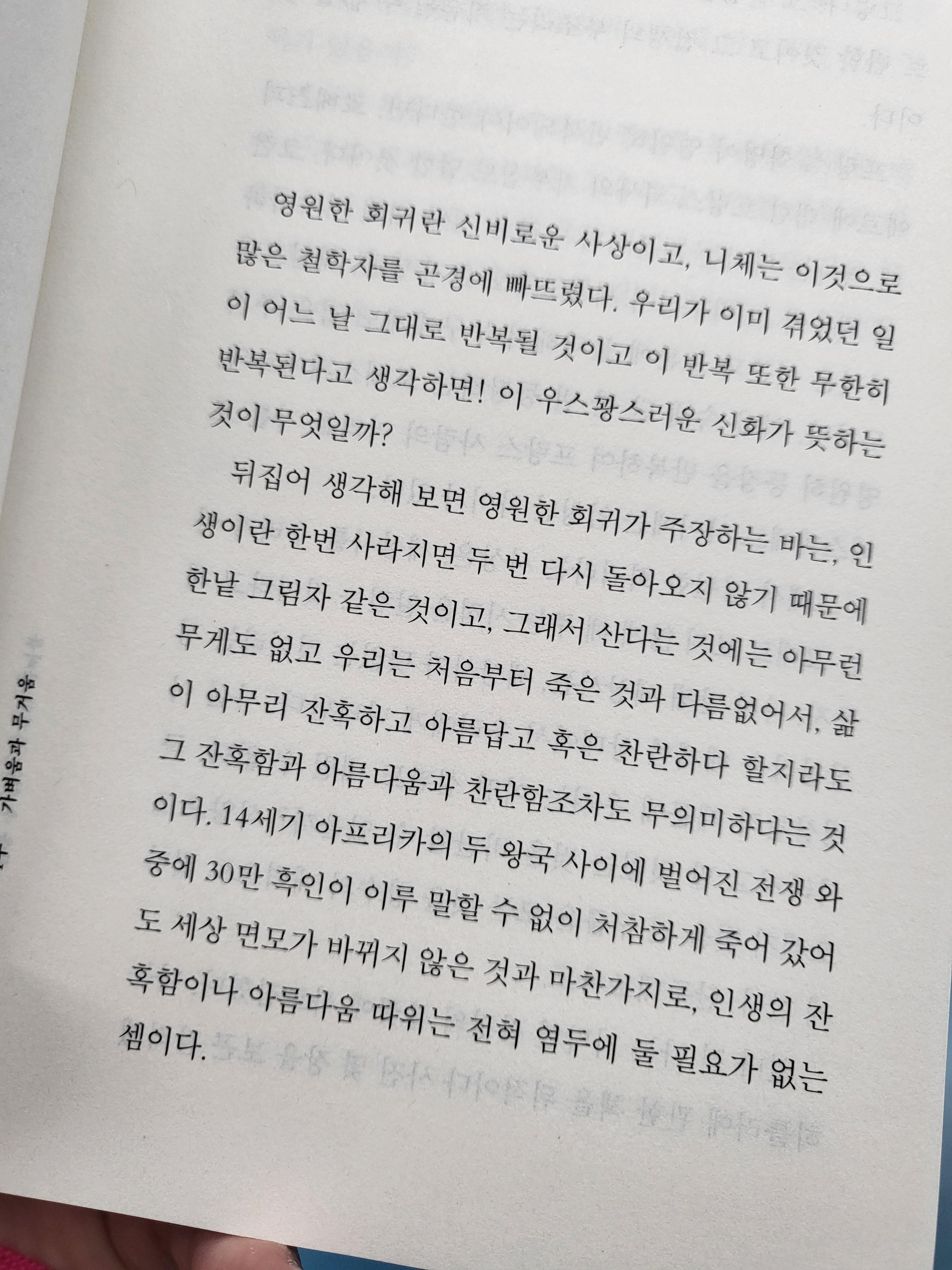 책을 읽기 시작할 때부터 마지막 장을 읽을 때까지 제목의 의미에 대해서 생각해보면서 읽었다. 처음에는 대놓고 여성 편력으로 바람을 피는 토마시를 바라 보며 테레자가 느끼는 감정인것 같았다. 로맨스와 페미니즘에 대한 이야기인가도 싶었다. 좀 더 읽다보니 사바나와 프란츠의 이야기가 나오는데, 김민희와 홍상수가 생각나는 상황이다. 유부남과 연애하면서도 결코 자신을 완전히 내주지 않는 젊은 여성 화가, 부인을 살뜰히 배려하면서도 외도를 통해 절절하게 사랑을 탐닉하는 대학 교수, 그리고 남편의 외도를 알면서도 냉정하게 자신의 생활을 유지하는 교수의 아내. 모두 각자 자신의 길을 간다. 사비나는 갑자기 떠나고 프란츠는 방황하지만 부인은 당황하지 않는다. 사랑이 전투고 끝까지 싸우겠다는 부인을 두고 그는 다른 여학생과 동거를 시작한다. 베트남으로 반공행진을 하러 가지만 그 곳에서 허망하게 돌아와서 마지막까지 피하고 싶은 부인의 눈 앞에서 눈을 감게 된다. 저마다 자신의 참을 수 없는 가벼움에 대해서 회한에 빠진다. 금방이라도 우울하고 무기력하게 무너저 버릴것 같은데, 용케 그런 삶을 거부하지도 부인하지도 않으면서 묵묵히 삶의 발걸음을 옮긴다.
