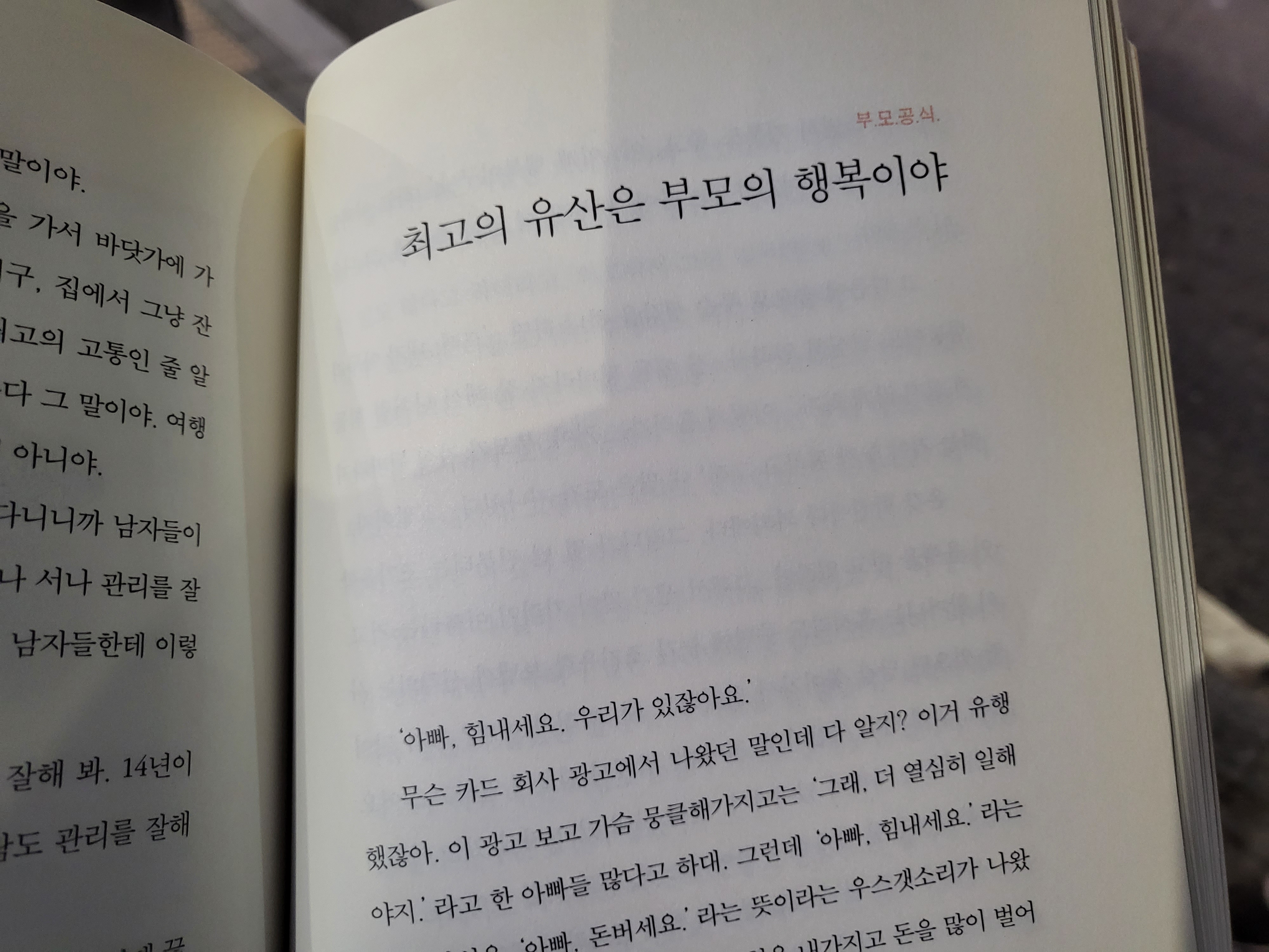내리 사랑은 동양 문화권에서 유난히 강한것 같은데, 부모와 자식간의 그 마음을 모르는 것은 아니지만, 받는 자식도 얼마나 부담이 될까 싶은 생각이 든다. 무엇보다 부모나 자식 모두 각자 자기 자신의 삶에 조금 더 집중했으면 좋겠다. 칼릴지브란의 결혼에 대하여라는 시에 나오는 구절처럼 서로 사랑하되 서로를 구속하지 않을 때 진정으로 아름다운 관계가 될 수 있지 않을까?