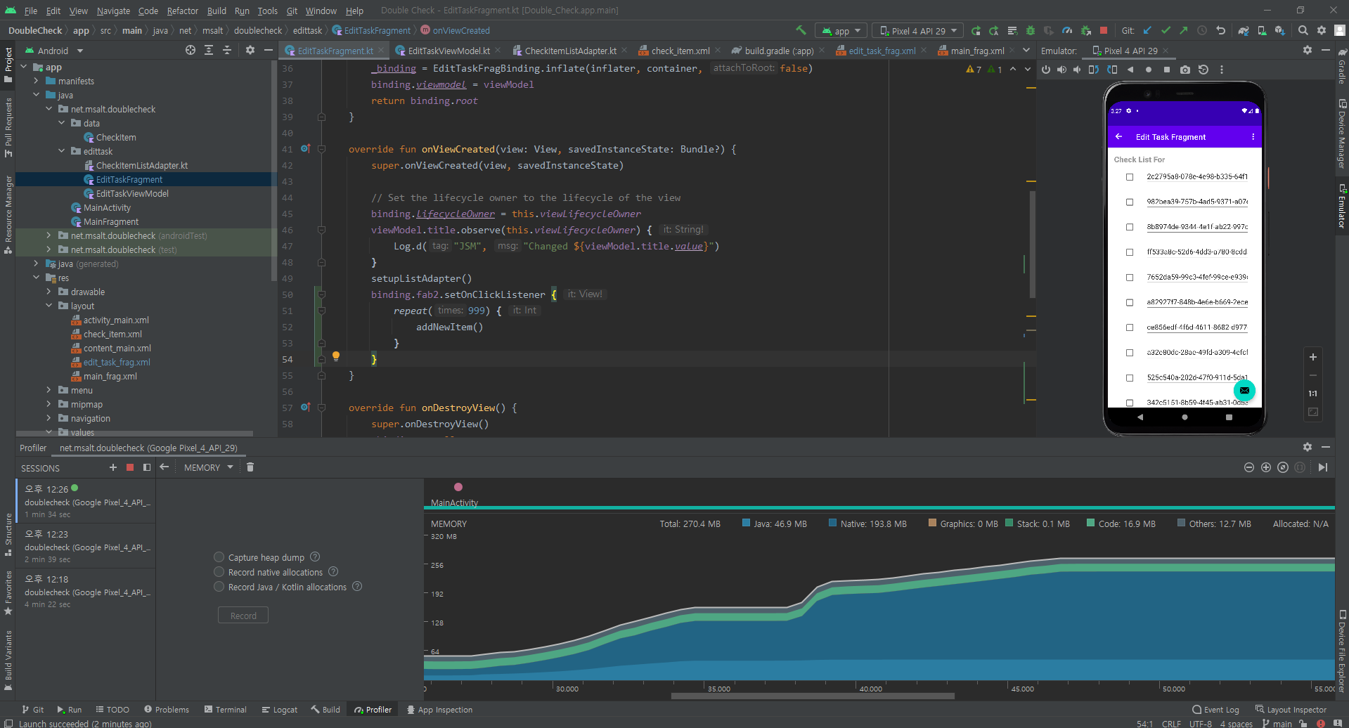 플로팅 버튼을 누르면 10000개의 아이템이 추가되도록 했더니 앱이 죽는다. 1000개로 해보니까 메모리가 대략 200MB 정도 늘어난다. 메모리는 native 쪽에서 대부분 사용하고 있으며 data class를 만드는 것만으로는 거의 차이가 없고, 바인딩 되어 있는 리스트에 추가 할 때 메모리가 많이 사용된다. 이것 저것 대충 해봤는데, 단방향으로 변경해도 비슷하게 증가하고 LiveData 사용안하고 String으로 해도 동일하다. 그냥 RecyclerView 자체가 그 정도 소모하나 보다. 프로파일링은 나중에 다시 더 해봐야겠다.