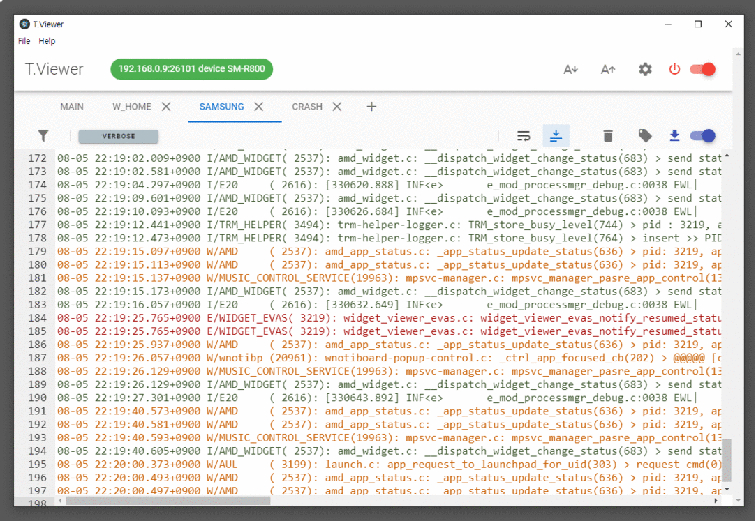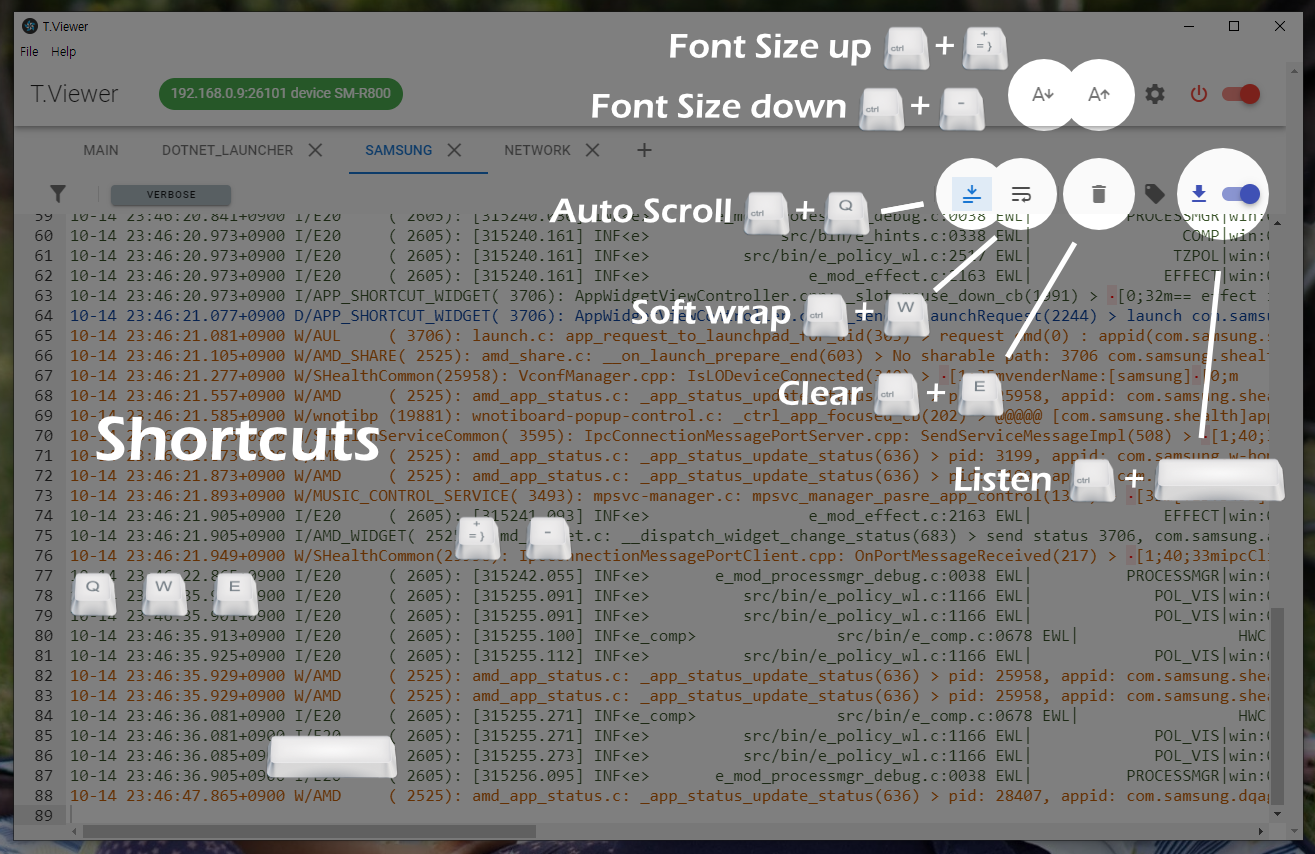 Cross Platform Tizen Log Viewer를 소개합니다. T.Viewer는 윈도우즈와 리눅스 데스크탑 PC에서도 타이젠 단말의 로그를 쉽게 볼 수 있는 프로그램입니다. Javascript, css, html의 웹 기술을 사용해서 윈도우즈, 리눅스 그리고 MAC에서 구동되는 앱을 만들 수 있는 electron 프레임웍을 이용해서 개발되었으며, GUI framework으로 vuetify를 사용하였습니다. MIT 라이센스로 공개된 오픈소스 프로젝트로써 T.Viewer Github repository에서 누구나 다운받아서 사용할 수 있습니다.